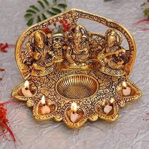 Metal Laxmi Ganesh Saraswati Idol Oil Lamp Diya Deepak 5 Divi Deepam Statue, Sure to be admired by your guests